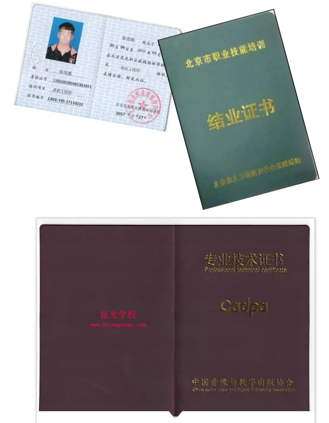 證書(shū)頒發(fā):經(jīng)過(guò)培訓(xùn)考試合格者頒發(fā)國(guó)家級(jí)行業(yè)協(xié)會(huì)專(zhuān)業(yè)技術(shù)《錄音工程師》等級(jí)證書(shū) 、北京市人力資源和社會(huì)保障局的《結(jié)業(yè)證書(shū)》 及《北京昆光學(xué)校培訓(xùn)結(jié)業(yè)證書(shū)》