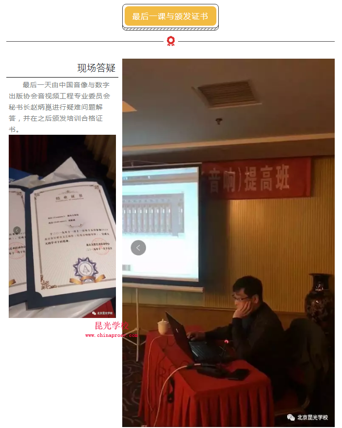 最后一天由中國(guó)音像與數(shù)字出版協(xié)會(huì)音視頻工程專業(yè)委員會(huì)秘書(shū)長(zhǎng)趙炳崑進(jìn)行疑難問(wèn)題解答,并在之后頒發(fā)培訓(xùn)合格證書(shū)。